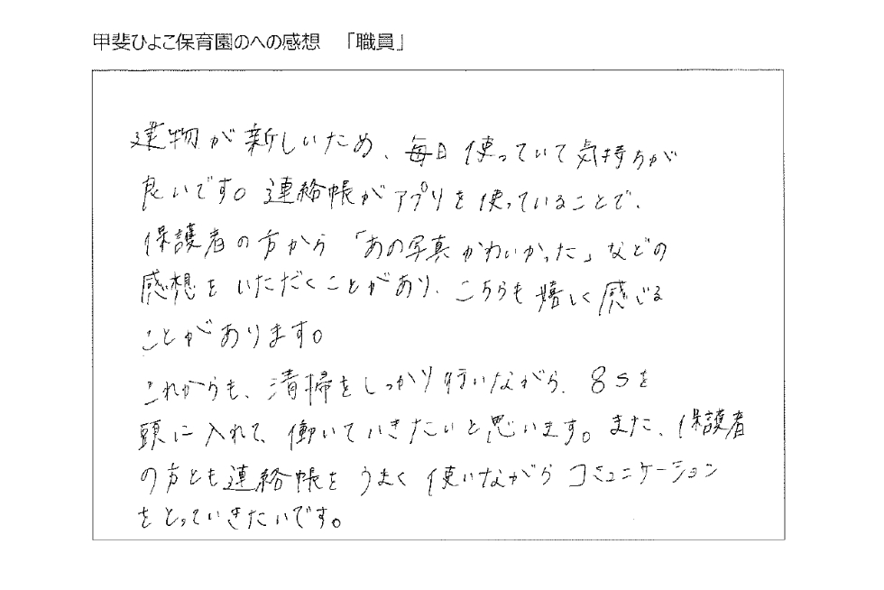 を行い年次別に成長する子どもの保育の質を確認する満足度調査を「スマホ調査表」で簡単入力、コメントも書けますので手軽に保護者や働き手の生の言える機会を作り迅速な改善対応が可能な体制が必要となります。